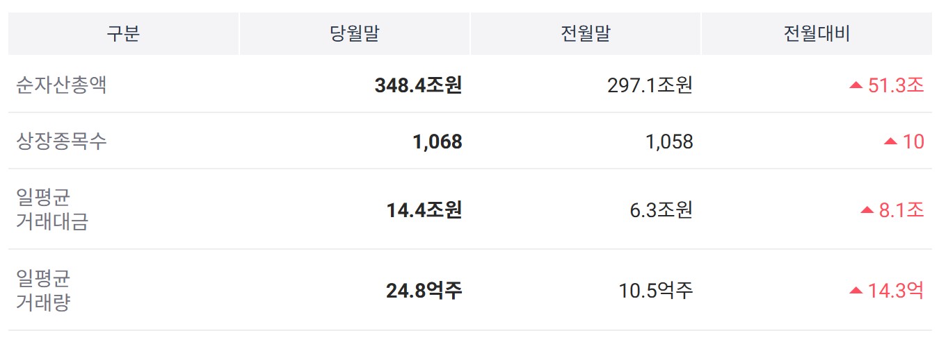 코스콤 ETF CHECK에 따르면 지난 1월 말 기준 국내 ETF 순자산총액은 348조 4574억원으로, 전월(297조1401억원) 대비 51조3173억원 증가했습니다.