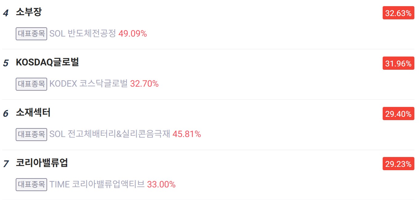 1월 말 기준 ‘K-반도체’의 한 달 평균 수익률은 38.98%로 핫 테마 1위를 차지했습니다. 이어 ‘은’ ETF의 한 달 평균 수익률은 34.12%로, 핫 테마 2위 자리에 올랐습니다. ‘KOSDAQ150’ ETF는 한 달 평균 수익률 32.73%, ‘소부장’ ETF도 한달 평균 수익률 32.63%의 수익률을 기록하며 각 3,4위를 차지했습니다. ‘KOSDAQ글로벌’ ETF는 31.96%를 기록하며 5위를 차지했습니다. ‘소재섹터’ ETF는 29.40%, ‘코리아밸류업’ ETF는 29.23%를 기록하며 6위, 7위를 차지했습니다.